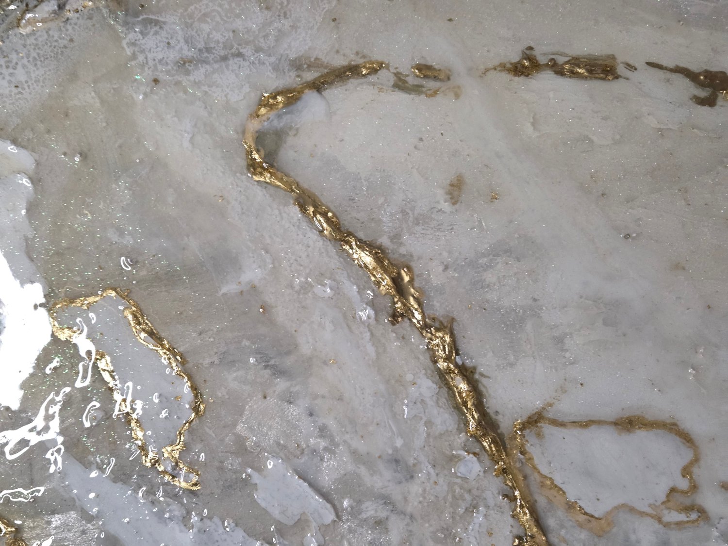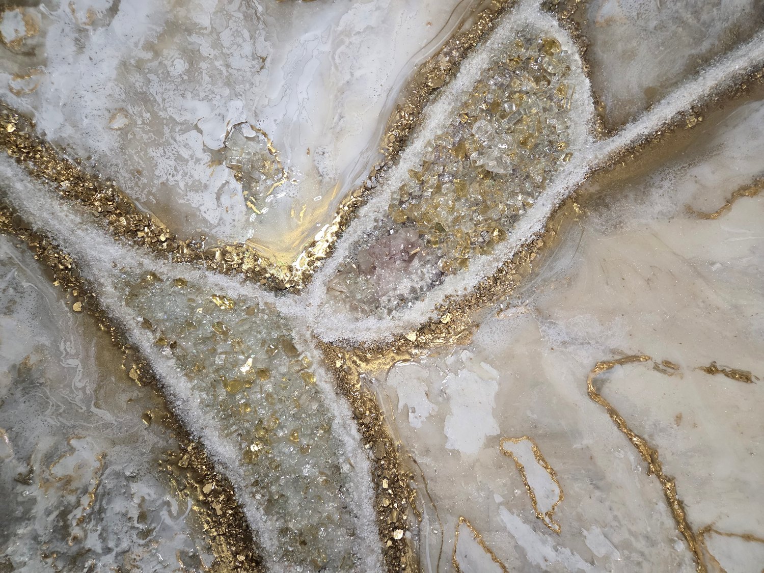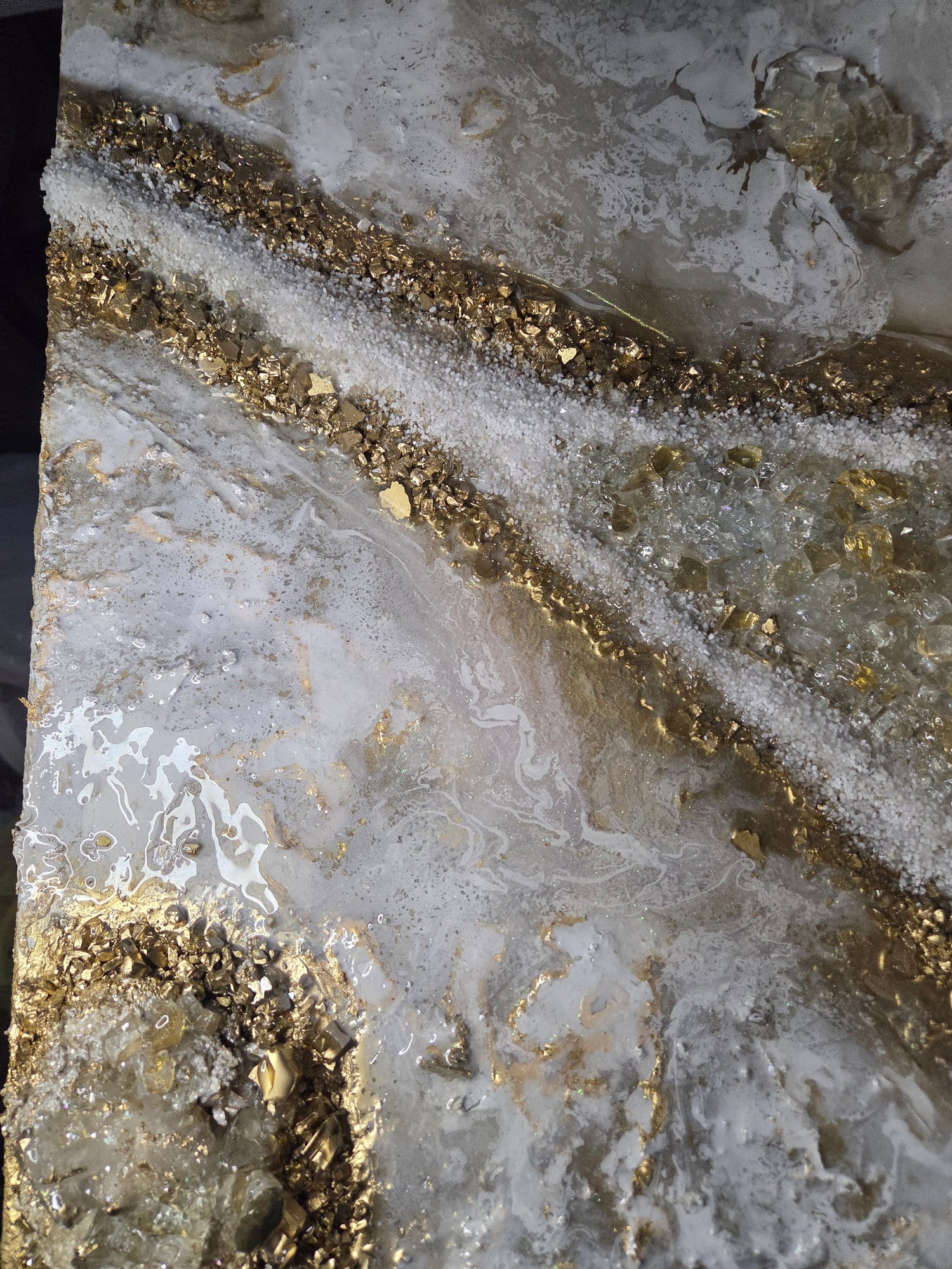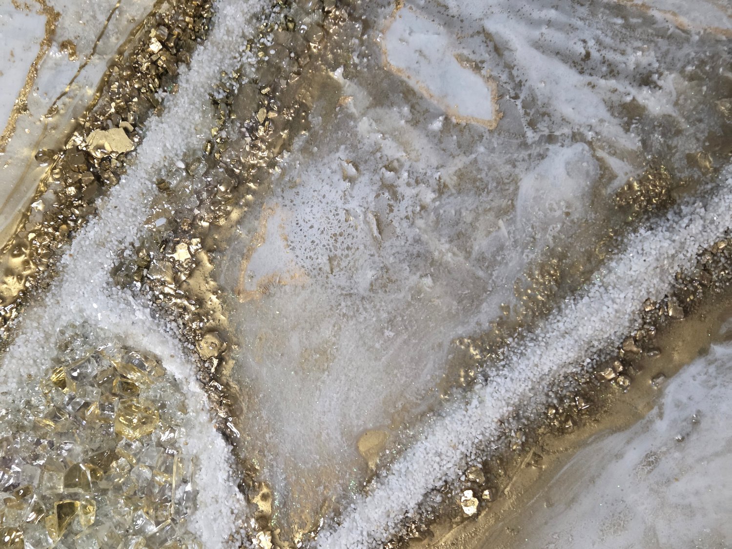 Amethyst, glass, resin, gold leaf, fire glass on canvas.